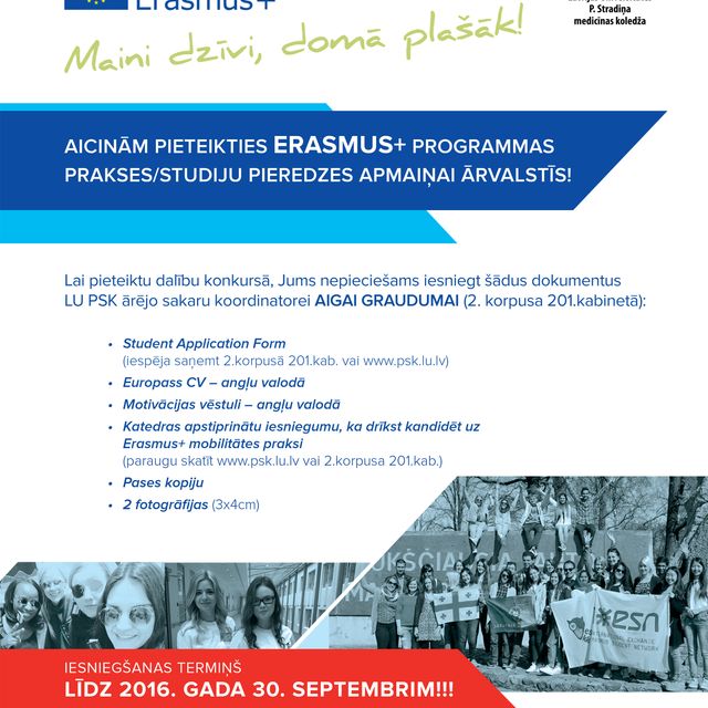 • Katedras apstiprinātu iesniegumu, ka drīkst kandidēt uz Erasmus+ mobilitātes praksi (paraugu skatīt šeit vai LU PSK 2. korpusa 201. kab.);