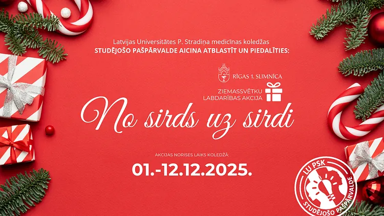 Atbalstot Rīgas 1. slimnīcas iniciatīvu, arī šogad Adventes laikā Latvijas Universitātes P. Stradiņa medicīnas koledžas Studējošo pašpārvalde aicina koledžas studentus un darbiniekus piedalīties labdarība akcijā “No sirds uz sirdi”. Sarūpējot sirsnīgas Ziemassvētku dāvanas, mēs kopā varam iepriecināt Rīgas 1. slimnīcas Īslaicīgas sociālās aprūpes centra klientus (ĪSAC).